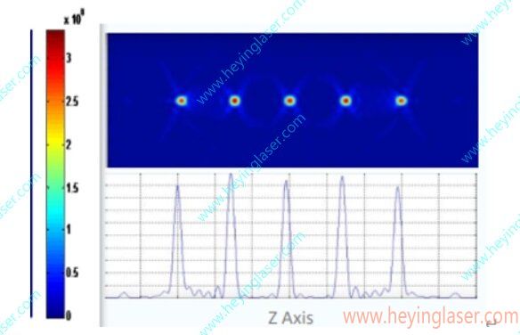 光束在经过多焦点DOE后会形成间距近乎相等的焦点一般焦点个数为2-15个不等,间距一般为几十到几百μm,各个焦点的能量也基本一致。